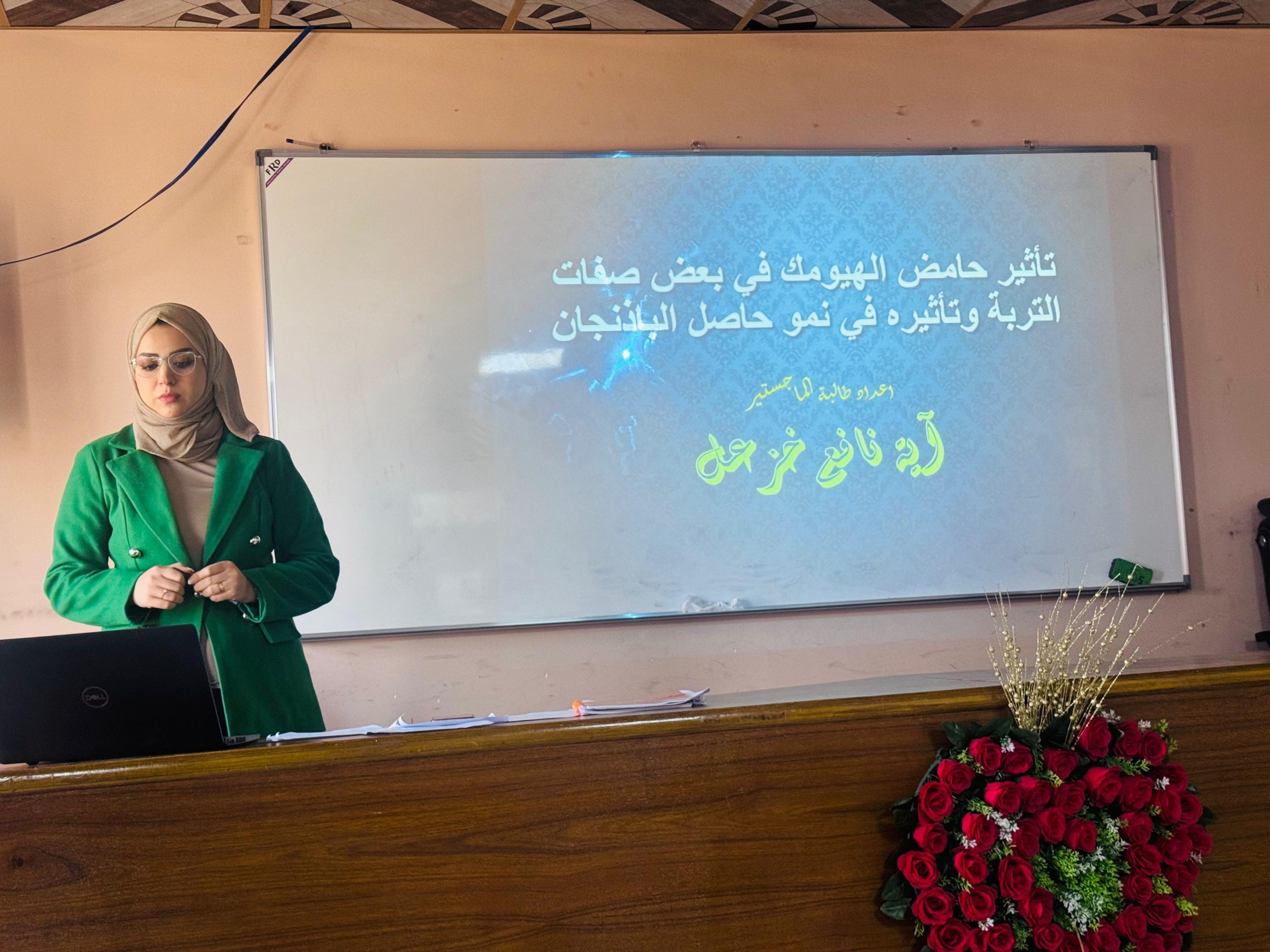 من ضمن الحلقات الدراسية لطلبة الدراسات العليا في قسم علوم التربة والموارد المائية في كلية الزراعة بجامعة ديالى ، القت طالبة الماجستير اية نافع خزعل مشروع بحثها بعنوان (تاثير حامض الهيومك في بعض صفات التربة وتاثيره في نمو حاصل الباذجان). …