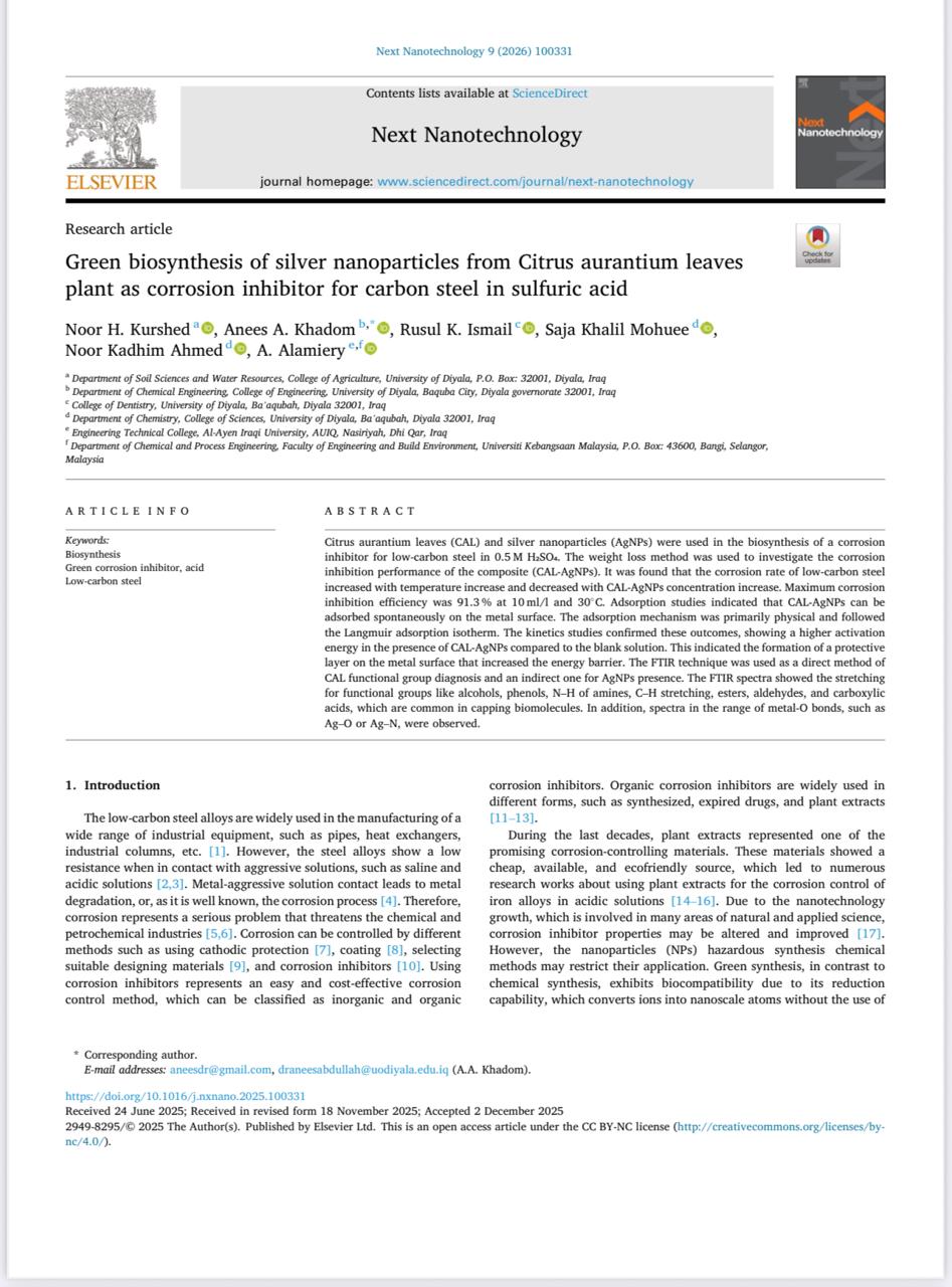 نشرت التدريسية في قسم علوم التربة والموارد المائية في كلية الزراعة بجامعة ديالى المدرس المساعد نور حاتم خورشيد مع فريق بحثي من الجامعة، بحثا علميا في مجلة عالمية Next Nanotechnology ضمن مستوعبات سكوباس حاصلة على Q4 ( 1 = CiteScore تابعة لدار النشر ELSEVIER